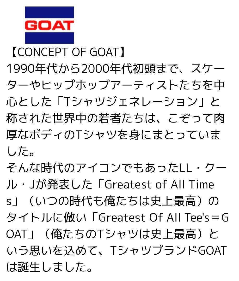 ボディも90年代を彷彿とさせるゆったりとしたボクシーシルエットで、衿の太めのリブと、若干短めに設定した着丈が特徴的なGOATのスタンダードモデル。ほどよく肉厚な7オンスのコットン天竺素材を完全オリジナルで製作し、GOATの特徴でもあるSTAY FRESH加工により抗菌防臭、制菌、抗ウイルスにも対応しています。アメリカ綿の空紡糸を丸胴に編み立て、ドライタッチで軽い着心地に仕上げました。透けを気にすることなく一枚で着用していただくことができます。